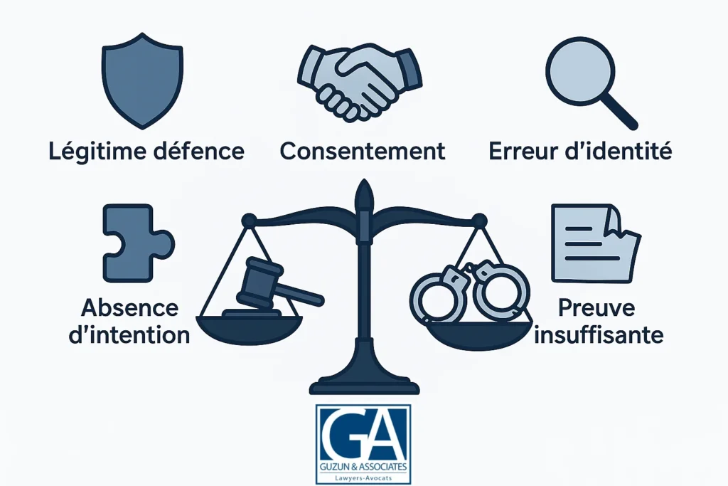 | Légitime défense | Force raisonnable et proportionnée pour se protéger ou protéger autrui | Acquittement complet ou retrait des accusations |