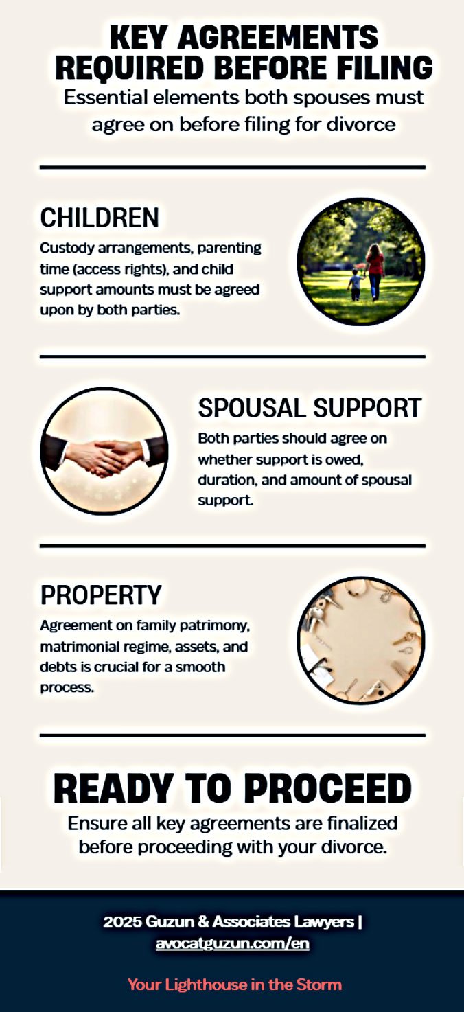 At Guzun & Associates Lawyers, we guide clients through every step of the process. Our team prepares all required documents, ensures compliance with the Superior Court of Quebec’s procedural rules, and helps couples finalize their divorce with dignity and efficiency.